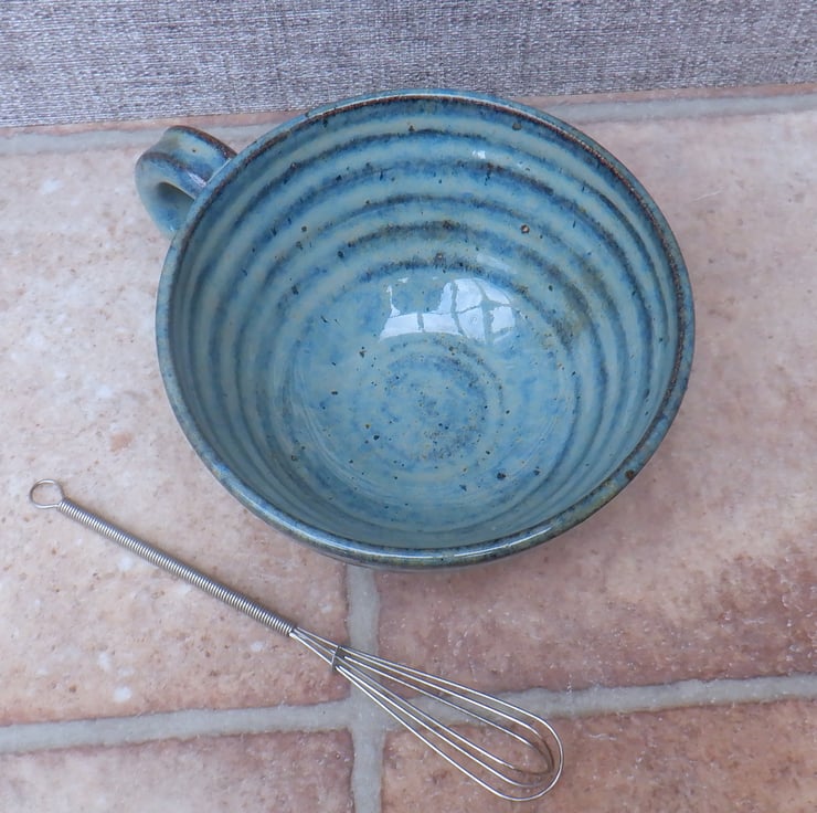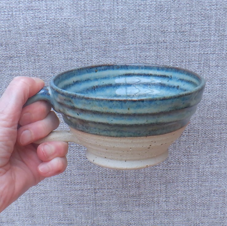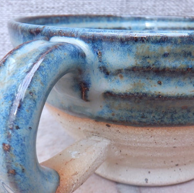I threw this large cocoa mug on my pottery wheel using strong off white stoneware clay, with a distinct speckle, and finished it in a lovely dark sea blue reactive glaze.