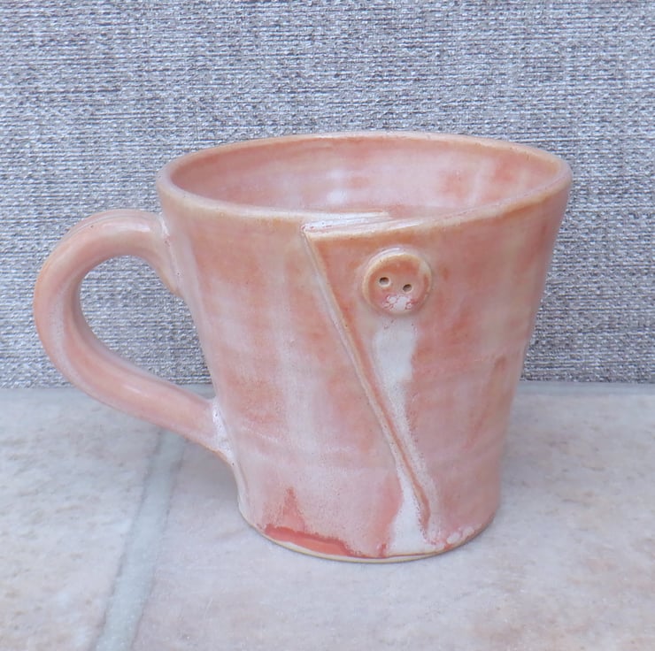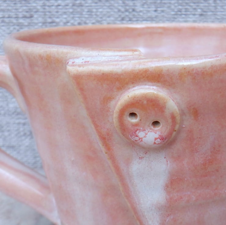I threw this mug on my pottery wheel using strong white stoneware clay, cut the side and reshaped it, then added a little button detail.