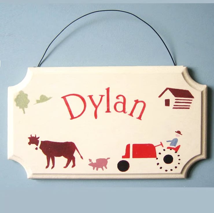 This door plaque, or hanger, is decorated with a lively farm picture, in a retro 50s style. It features a popular big red tractor and a brown cow.