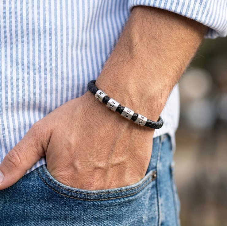 The Four ring Men's Personalised bracelet is made with genuine braided leather that is 6 mm in diameter and has a locking stainless steel connector that ensures that it will not come undone.