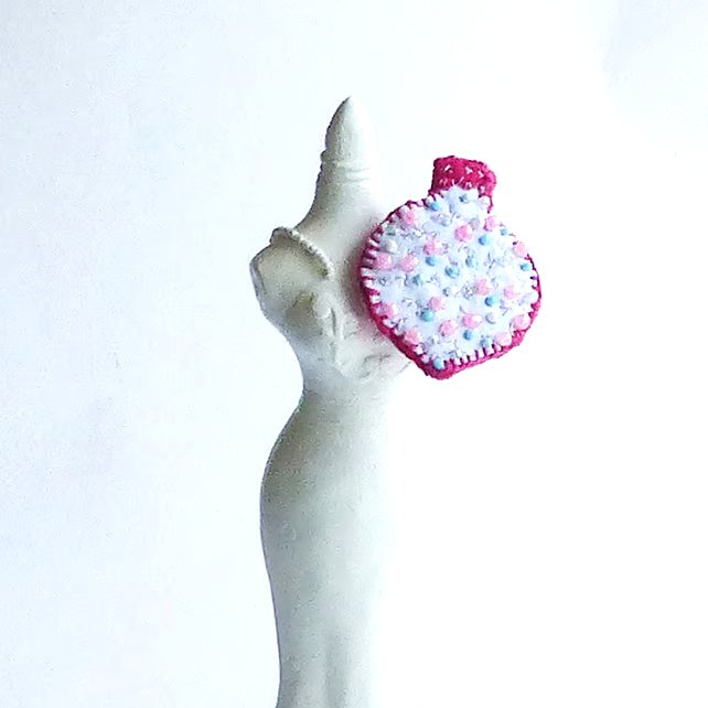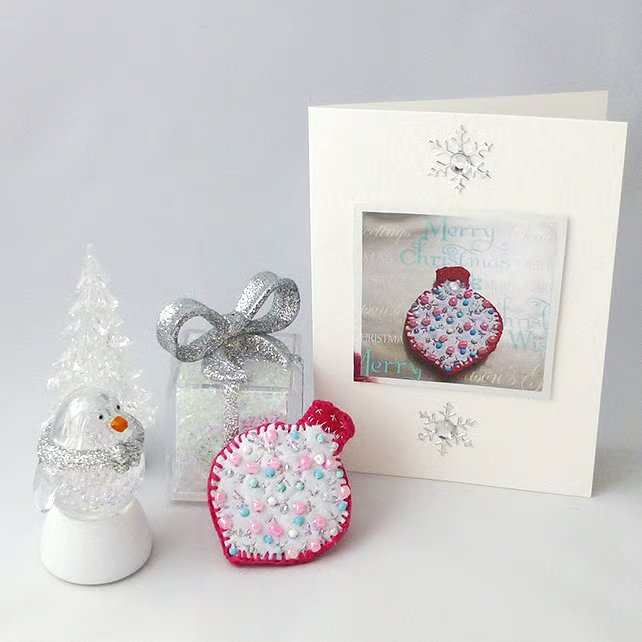 Handmade, with a cotton fabric front and pink felt back, the brooch is embellished with pink, pale blue, white and sparkly beads, along with silver metallic thread, all of which gives this brooch its real Christmas magic.