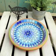 A 25cm (9.75 inch) diameter terracotta saucer with a mosaic made with glass tiles and a grey grout designed to repel algae and mould.