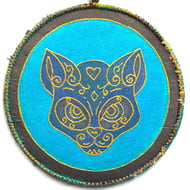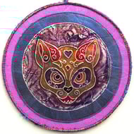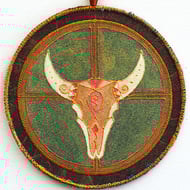 15cm roundel, hand painted fabric wall hanging plus macrame loop and danglers with wooden beads and driftwood. Original Owl design on embossed metal (recycled drinks can) stitched to a painted fabric background and velvet. Full length approx 80cm but can easily be cut shorter. I make these with my sister Mandy at Thrifty Drifter.