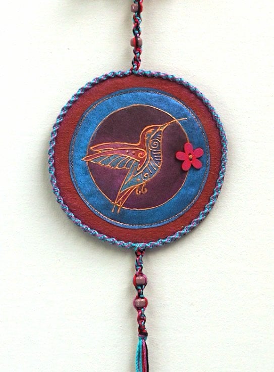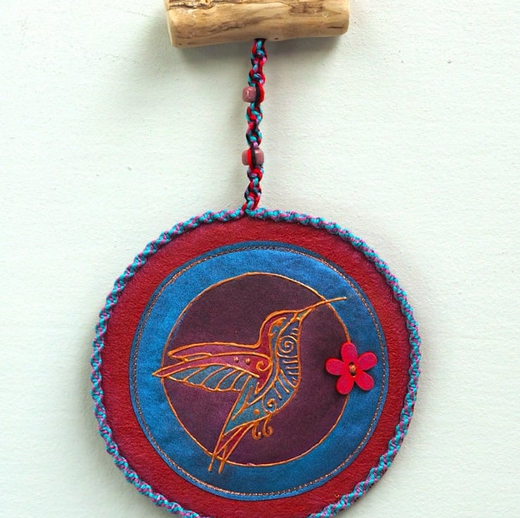 This Macrame Hummingbird Mandala measures 12.5cm (5") diameter with macrame loop,edging and danglers with collected driftwood and glass beads. Hand printed then painted, colourful bird. Outlined in copper relief with a wooden flower button detail on a painted fabric background. Approx 70cm overall length which can be easily cut shorter. The macrame and driftwood details are prepared and created by my sister Mandy at Thrifty Drifter.