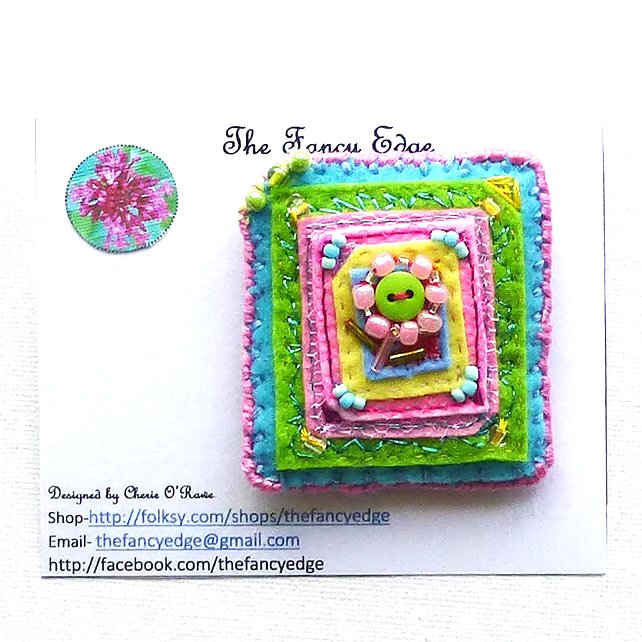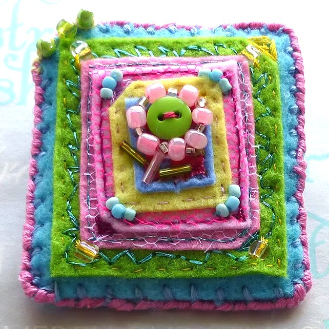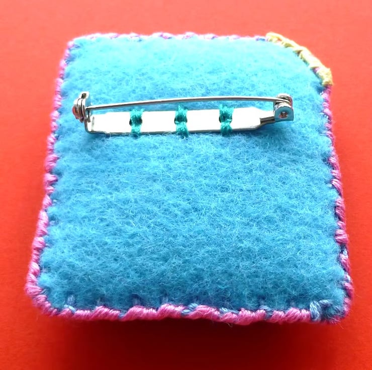 This colourful, handcrafted, appliqued brooch would look gorgeous pinned to the lapel of a jacket, or on a cardigan.