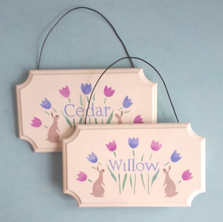 A great Christening or birthday gift, this personalised door hanger/plaque is decorated with adorable rabbits and pretty tulips in soft pastels. It will be an appealing feature in a child's nursery.