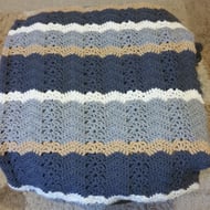 This is a lovely crochet blanket or throw made up of flower motifs in a neutral colour palette of shades of brown and grey surrounded by cream and edged with a beautiful lacy edge.