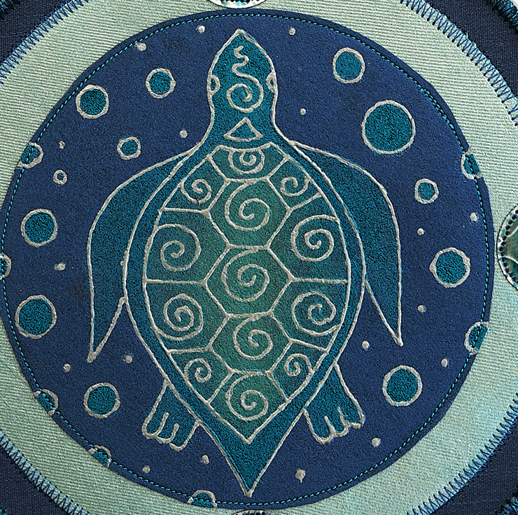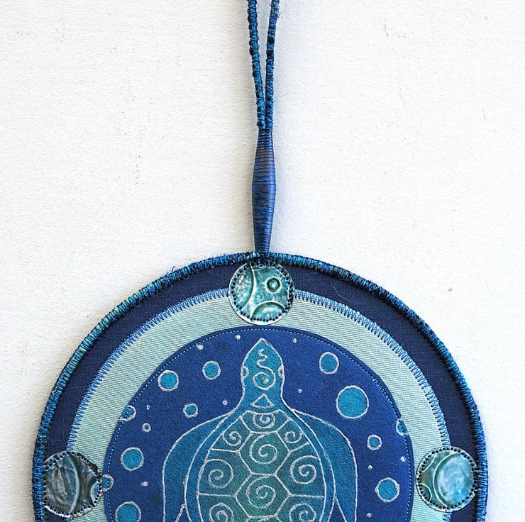 This hand painted fabric Turtle Mandala measures 17.5cm (6 1/2") diameter. It is single sided and stiffened on the reverse (plain black) to hold it's shape. It comprises of a hand cut lino print of my own design. It has then been over painted with pearlescent/metallic fabric paints, outlined with silver to make it 'pop' and stitched together. It features softened metal from drinks cans that have been stitched,inked and embossed at the 4 directions. Mixed yarns are zig zagged on the outer edge and a hanging loop with a single, hand rolled, painted, paper bead to finish it off on the top.