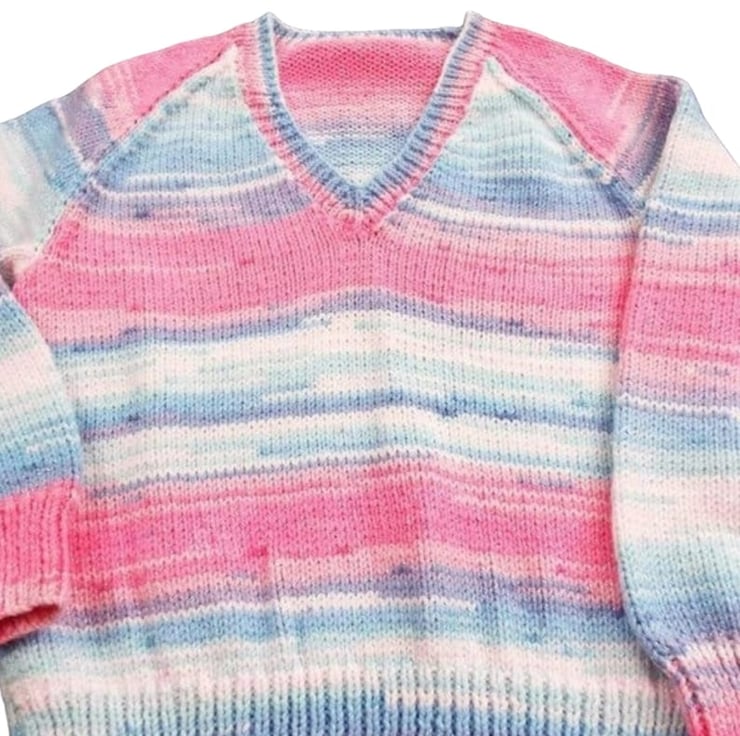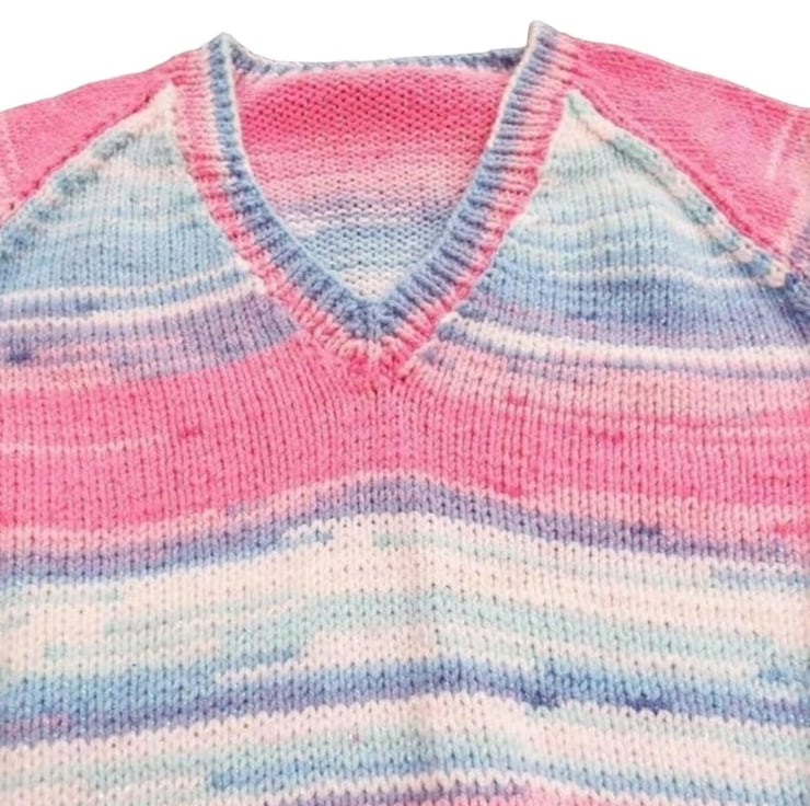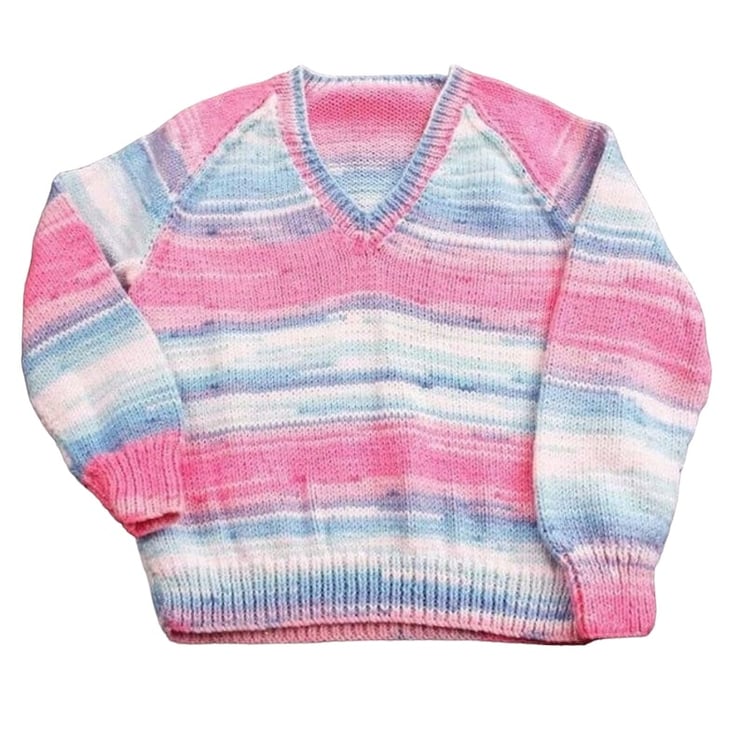 Check out this super cute girls' V-neck jumper with a fun, modern twist! Made with a sparkly yarn in pretty shades of pink, white, and blue, it adds a touch of shimmer to any little one's wardrobe. It's stylish yet playful, perfect for everyday wear or special outings.