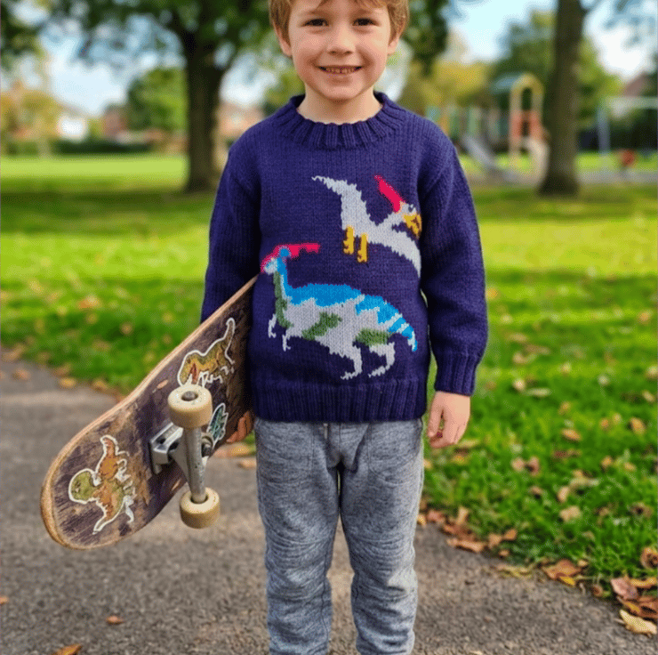 An easy and quick design to knit. The pattern includes colour coded sizes for ages from 4 to 13 years and large full-page coloured intarsia charts for the Dinosaurs.