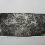 This sweet little drypoint etching is of a pretty lane we came across while exploring in deepest Exmoor. It is made from a plexiglass plate using fine etching tools and is printed with Divolo etching ink on Fabriano paper. The printed image measures approximately 2.5" x 5"". This is number 5 of a limited edition of 5.