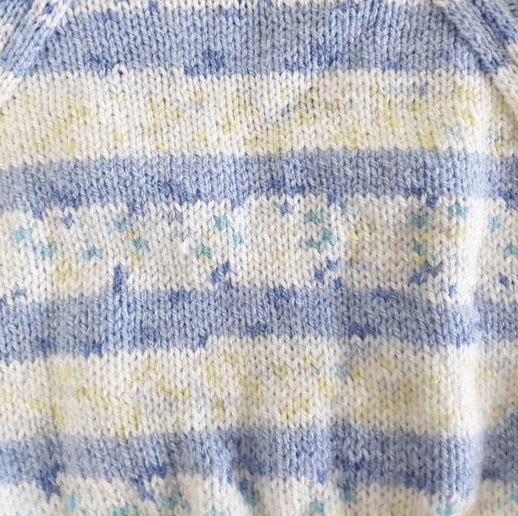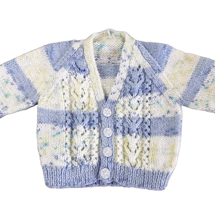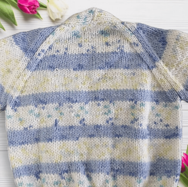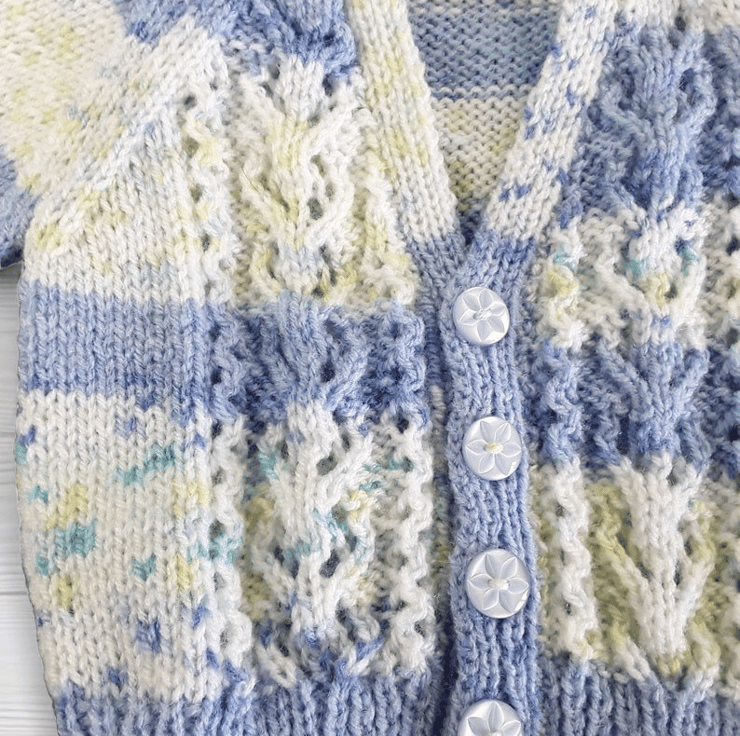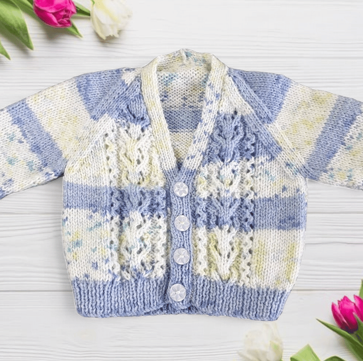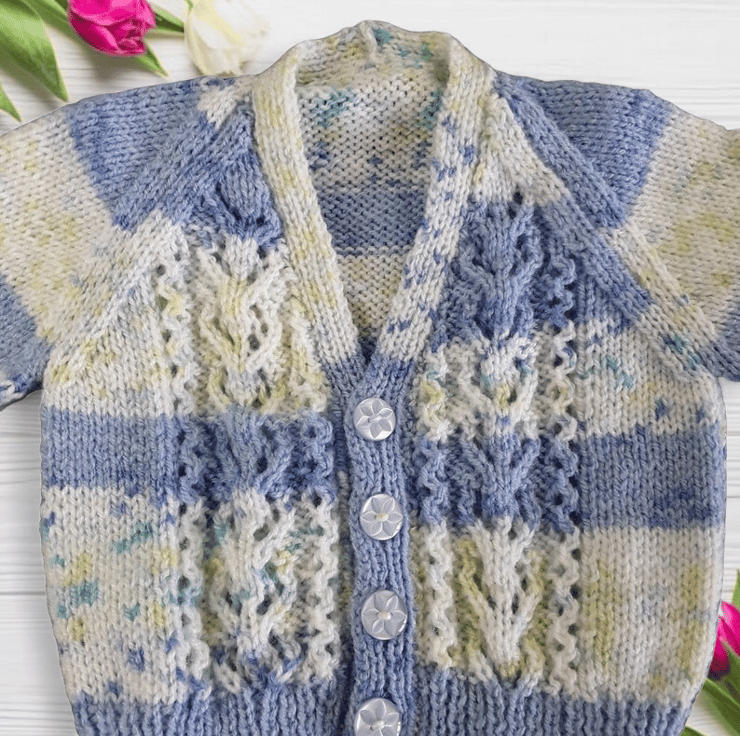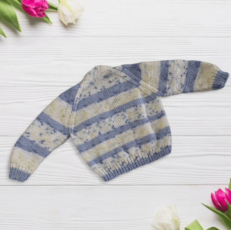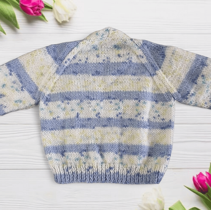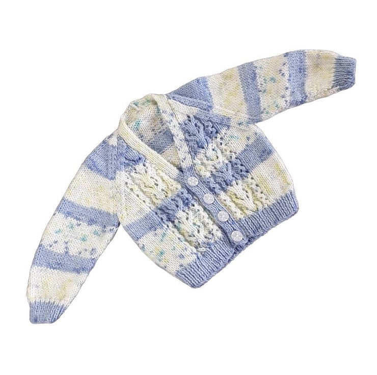 Hand-knitted Baby Cardigan in Blue and Cream. Meticulously crafted using a self-patterning yarn, the fusion of blues and creams creates a captivating visual effect.