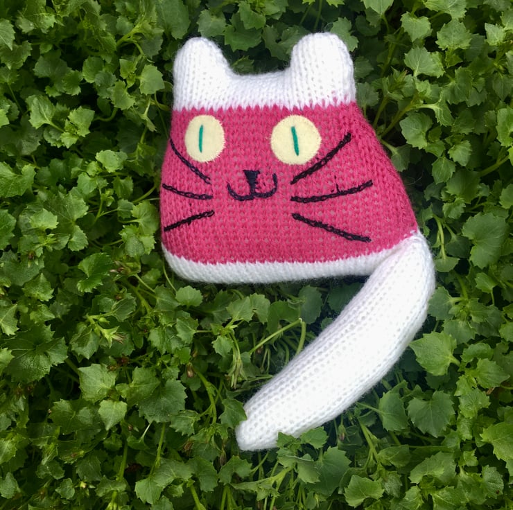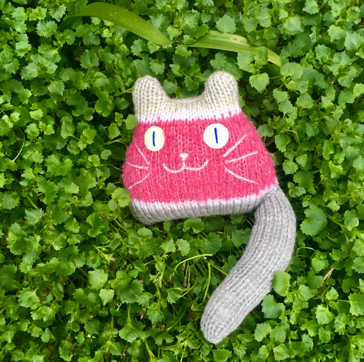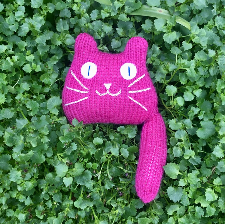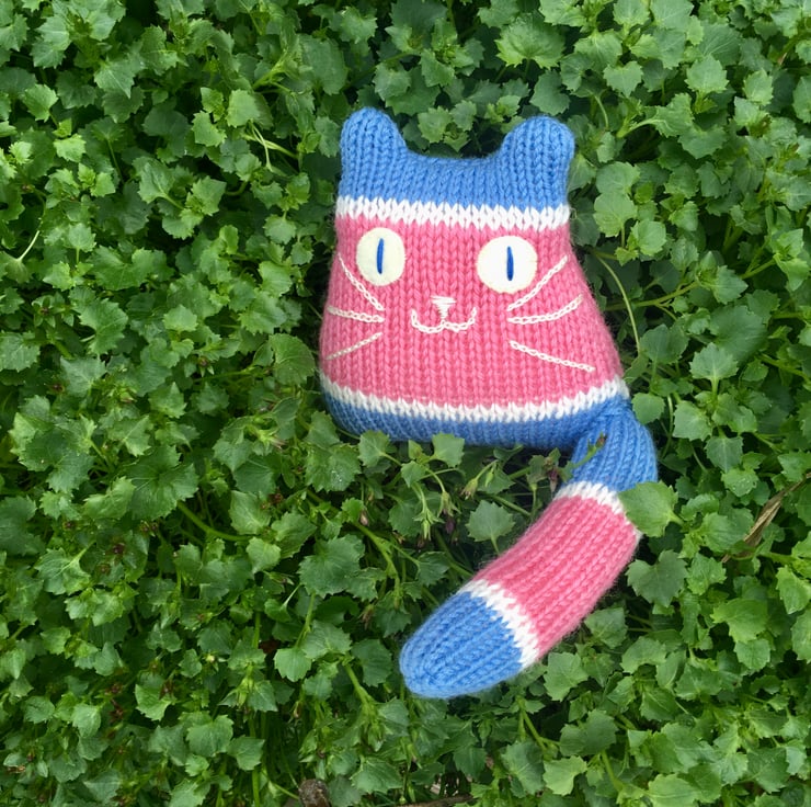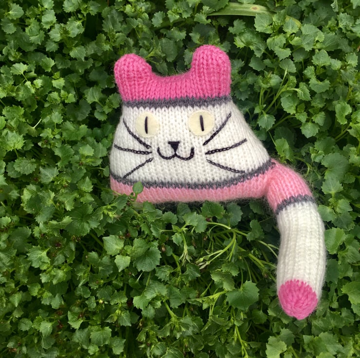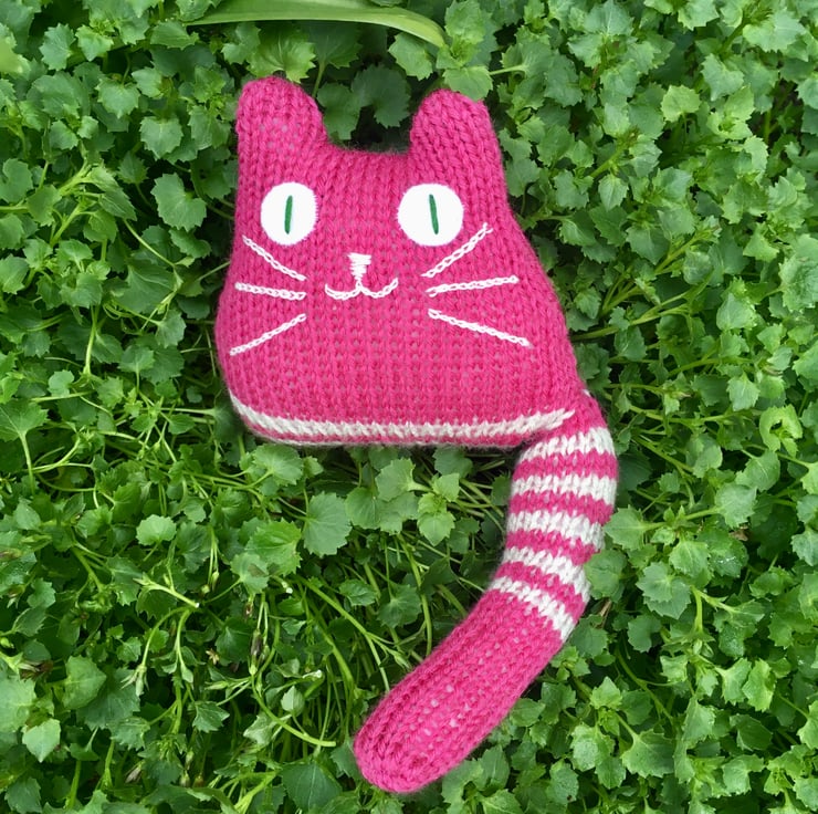 They are hand knitted from mixed acrylic yarns filled with safe soft toy stuffing. The whiskers and face are embroidered in a cotton thread and eyes are made from felt.
