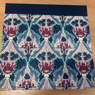 Lightweight cotton face covering. Two layers of cotton with non-woven interfacing in the middle. Plain black outer, lightly patterned off-white quilting cotton on the back.