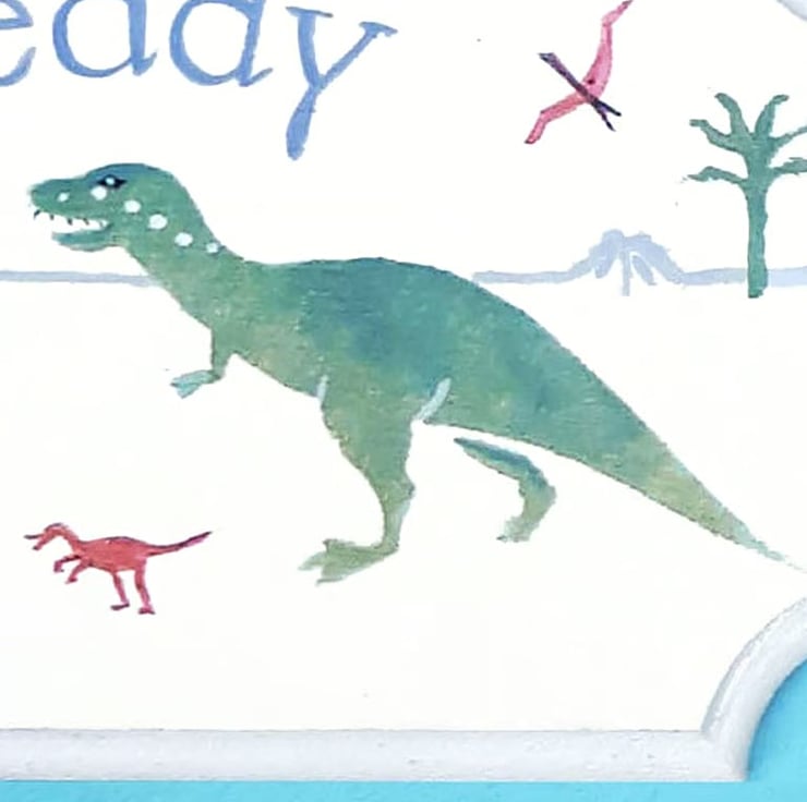 This personalised door hanger is decorated with children's favourite subject - a group of scary dinosaurs.