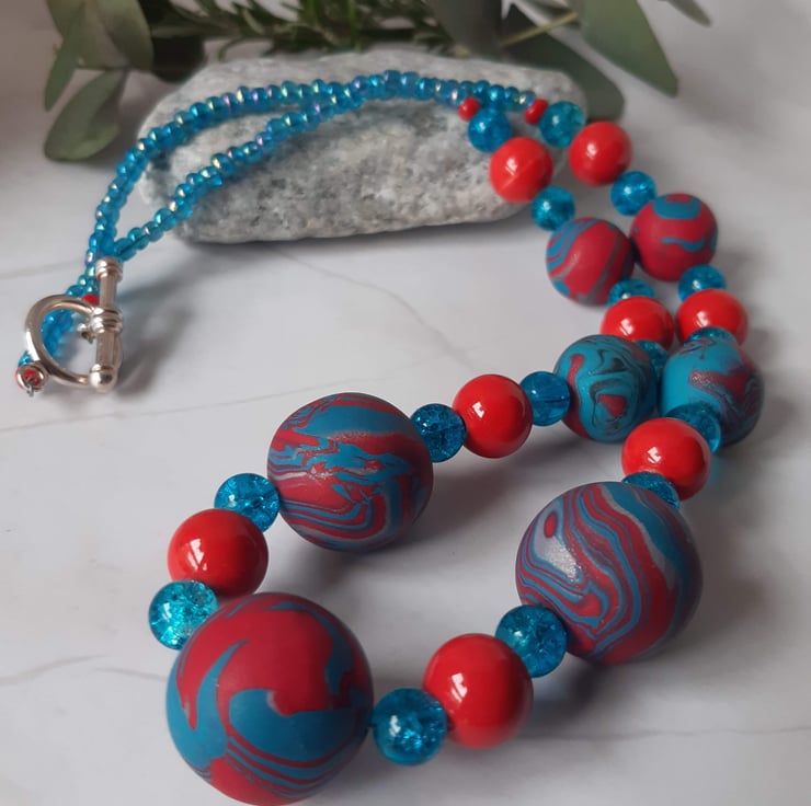 An unusual combination of turquoise and poppy red polymer clay are featured in this handmade necklace.