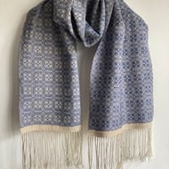 A handwoven wrap scarf in a block twill draft in 15 shades of Staithes on the North Yorkshire coast. The colours are repeated across the weft to produce visual blending- no two blocks are the same across the repeat.Soft and supple, the wrap is light and silky, and large enough to keep the draughts out. The colours are taken from many photographs of this beautiful place to capture the spirit of this gem of a village.