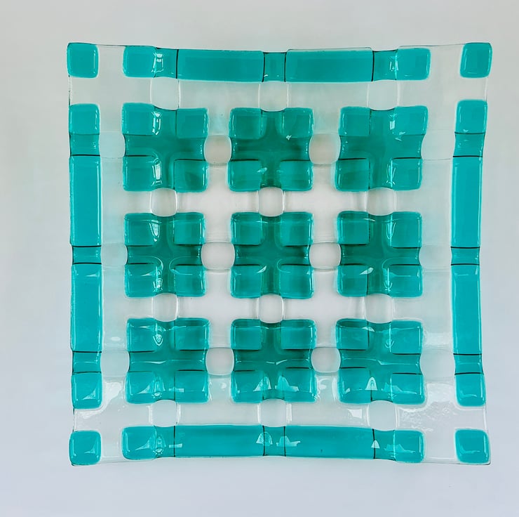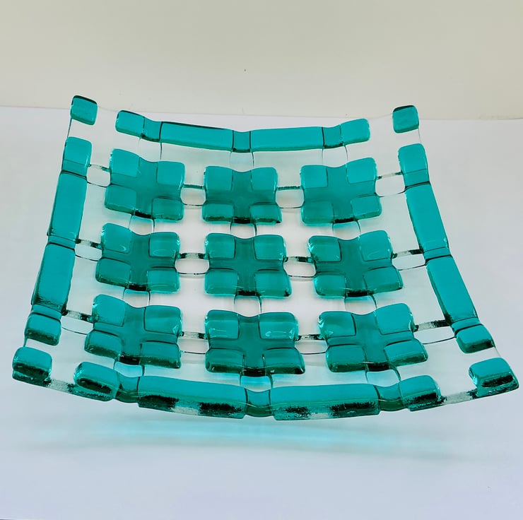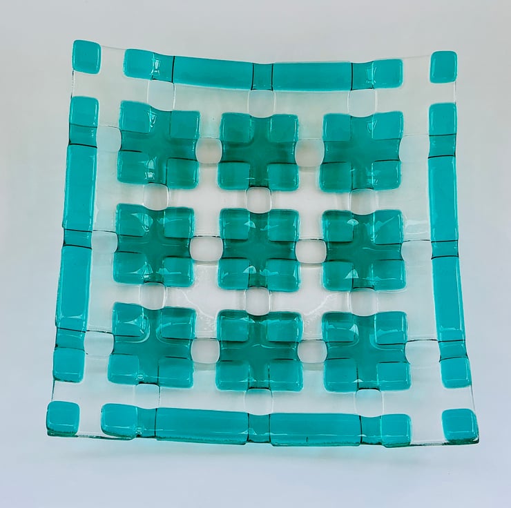 Fused glass shallow dish in an open squares design, using clear glass, teamed with a pretty transparent aqua. Constructed from a series of 3cm squares laid out in an interlocking grid pattern, edged with strips of aqua, and fired to a temperature that maintains some texture but allows the edges to soften and round off.