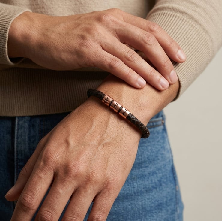 The 7th Wedding Anniversary Personalised bracelet is made with genuine braided leather that is 6 mm in diameter and has a locking stainless steel connector that ensures that it will not come undone.