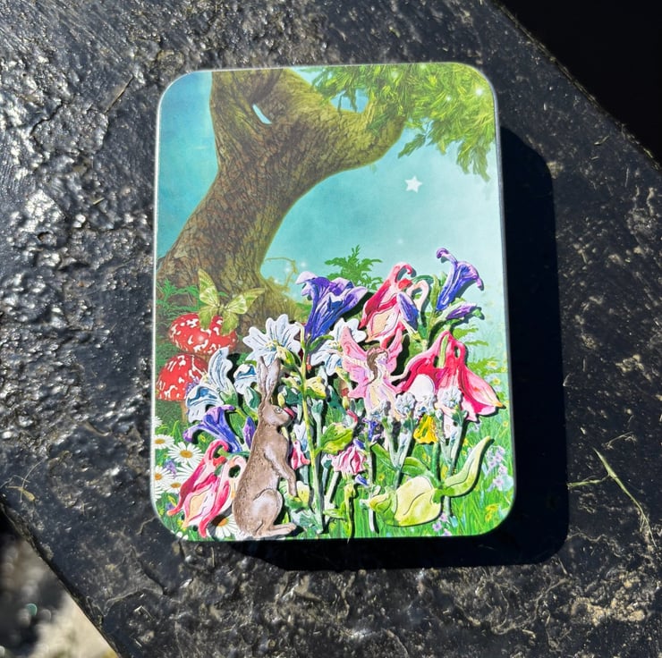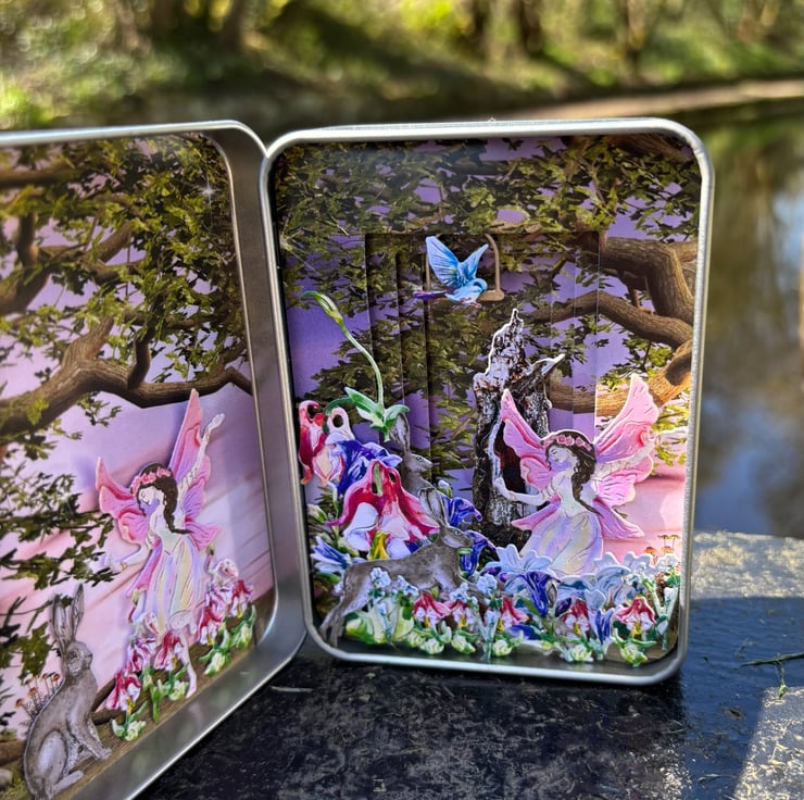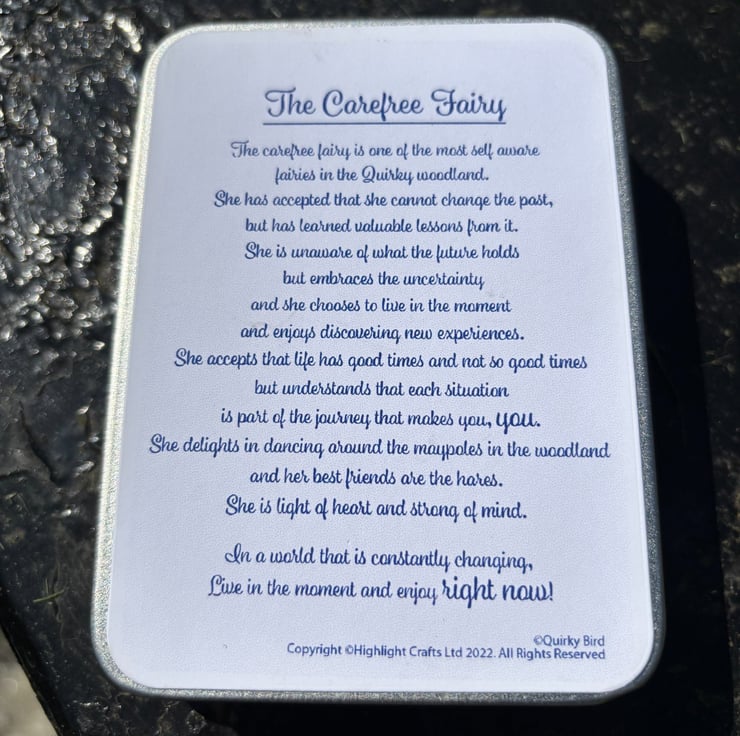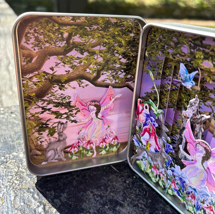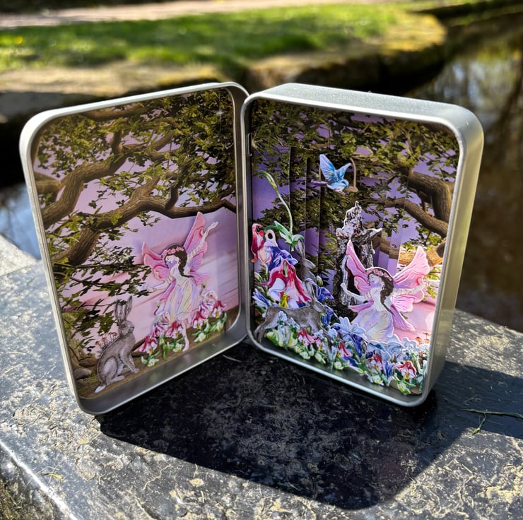 This beautiful Gift is set in a metal hinged tin, the main scene I have cut as a tunnel view, where the care free fairy is dancing through the woodland with her woodland friends surrounded by flowers, the lid of the tin is the same as is the front of the tin, on the back of the tin is a little story about her.