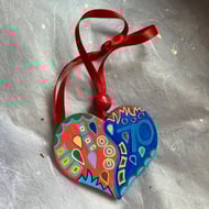 This wooden heart is hand painted in abstract patterns and varnished on both sides.