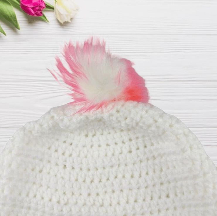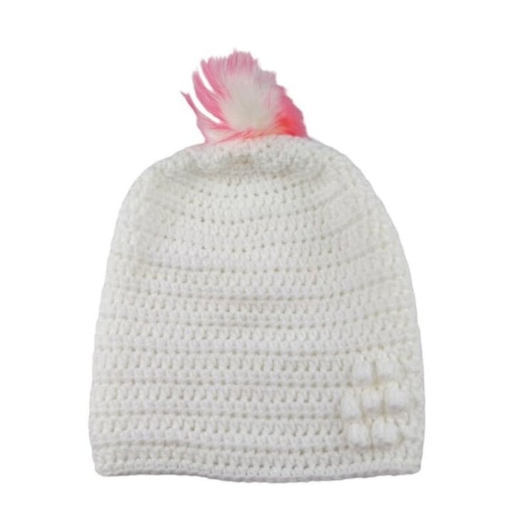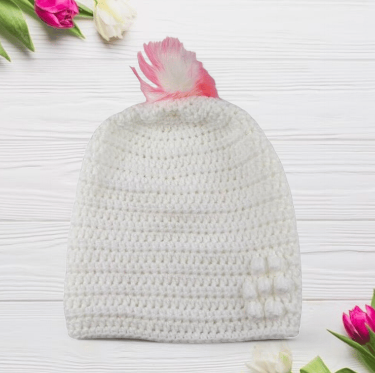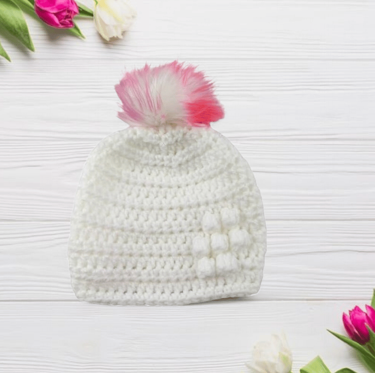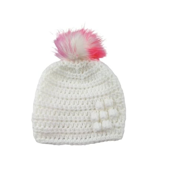 Each hat features a charming bobbly puff flower on the front left side for added character. The standout feature is the detachable faux fur pompom, which comes in elegant white with pink and purple tips. The pompoms attach easily with an elastic loop that fastens securely to a button inside the hat, providing a versatile and stylish accessory.