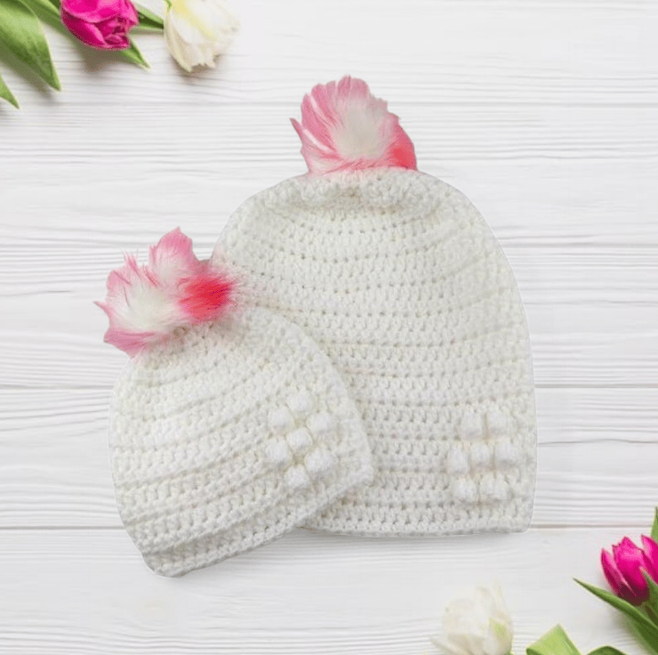 Stay cosy and stylish with these delightful matching crocheted hats for mums and babies, ideal for keeping you both warm on chilly days. Hand-crocheted with care from soft aran weight white yarn, these hats are perfect for outdoor adventures or casual outings.