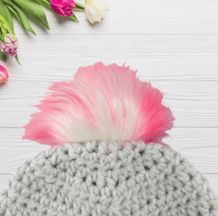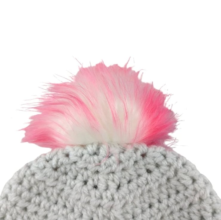 Featuring a charming bobbly puff flower on the front left side, this hat adds a playful and endearing touch to your baby's attire. What makes this hat truly special is the detachable faux fur pompom, elegantly white with delightful pink and purple tips, infusing a burst of color and vibrance into the design. The pompom easily attaches via an elastic loop fastened onto a button inside the hat, allowing for customization and effortless removal.