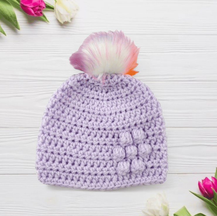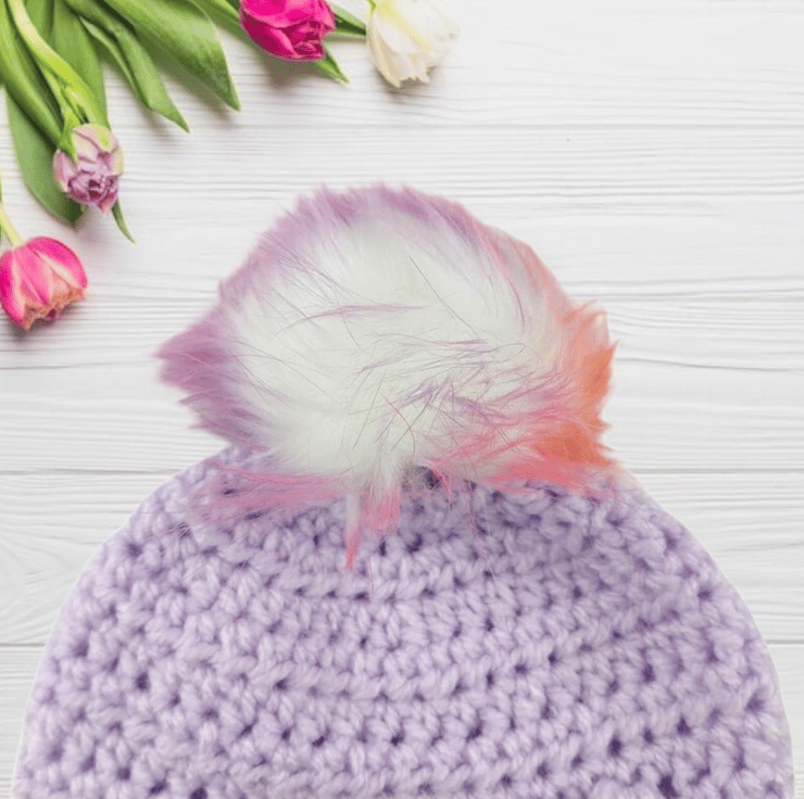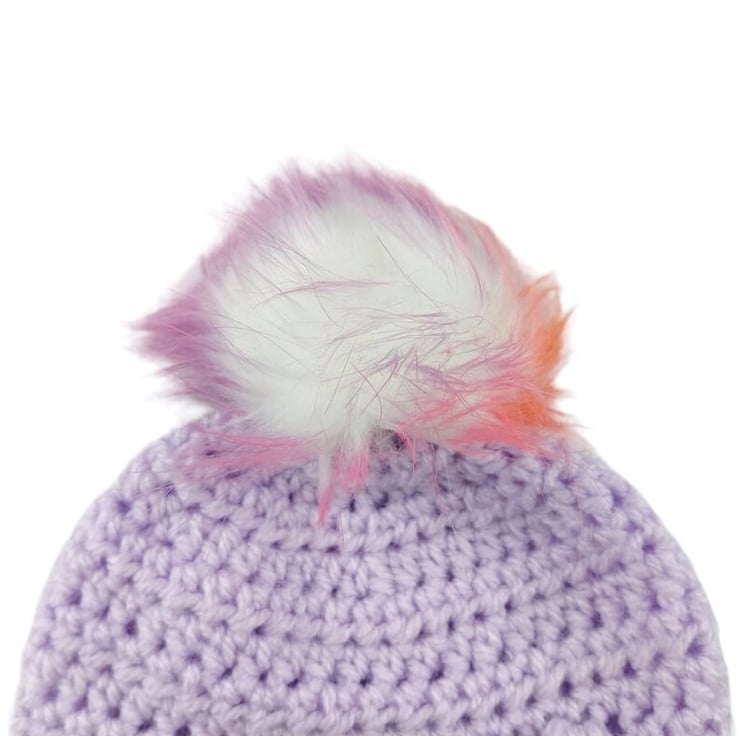 Featuring a delightful bobbly puff flower on the front left side, this hat adds a playful and endearing touch to your baby's attire. What makes this hat truly special is the detachable faux fur pompom, elegantly white with tips in lovely shades of pink, purple, and orange, reminiscent of a blossoming garden. The pompom easily attaches via an elastic loop fastened onto a button inside the hat, offering customization and effortless removal.
