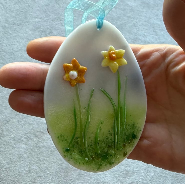 The glass egg is cut from white glass and decorated with coloured glass powders, chips and vitrigraph. I make the daffodils from glass powder, by forming in a silicone mould and then fusing separately. The decorated egg has been fused in my kiln to 745 degrees, a temperature which allows the separate pieces to fully fuse together, while maintaining texture. The decoration has then been drilled and threaded with a light blue ribbon, ready for hanging.