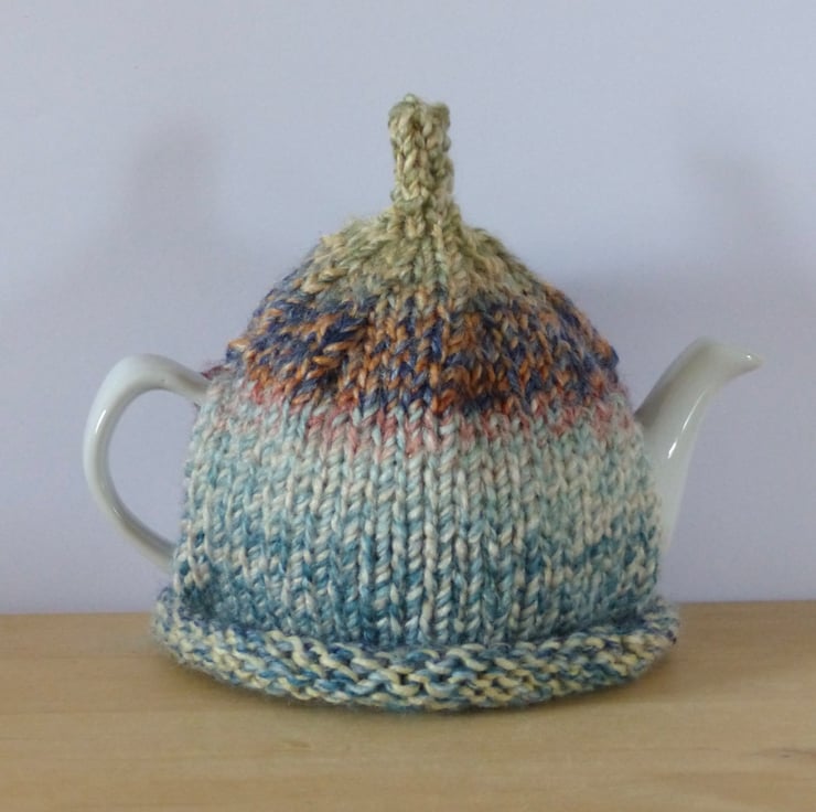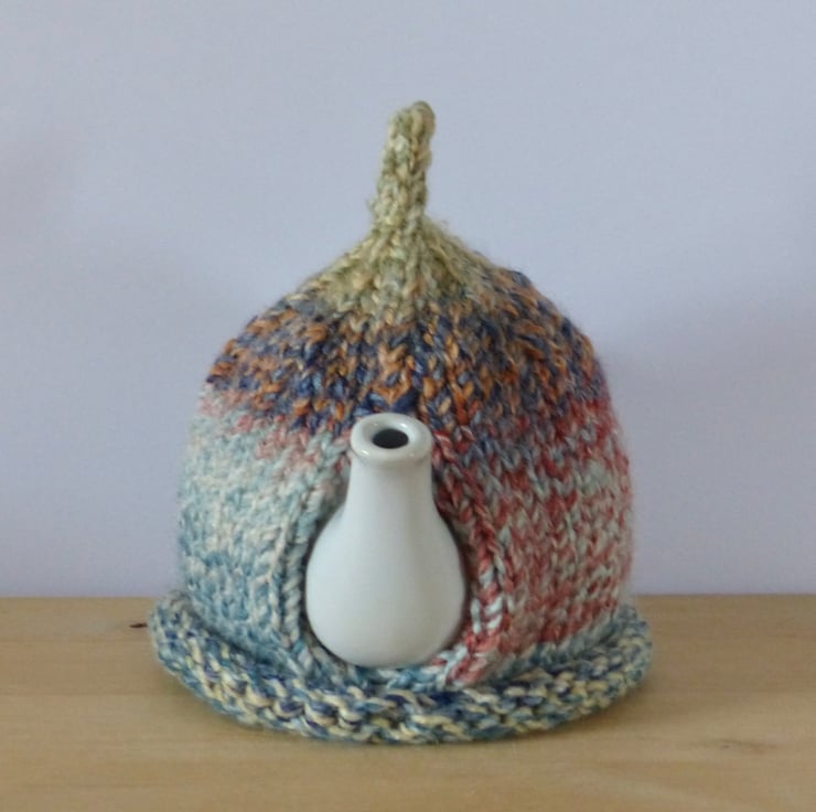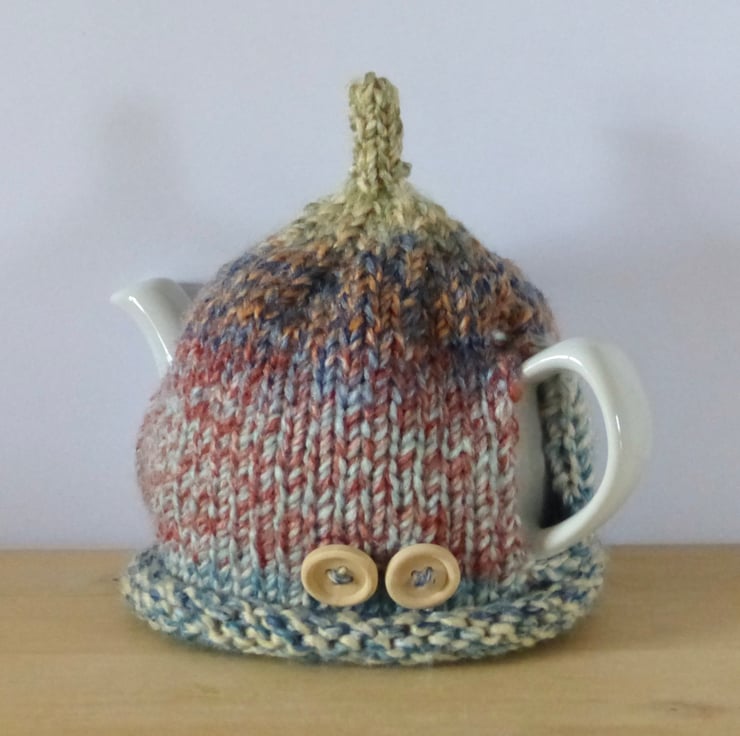A hand knitted Tea Cosy in a chunky variegated yarn in Country style colours - Greens, Blues, Reds etc. It has a 'pixie' top and two natural wood buttons on the front for decoration.