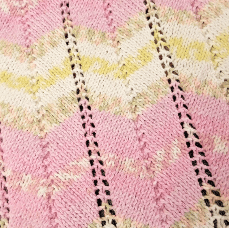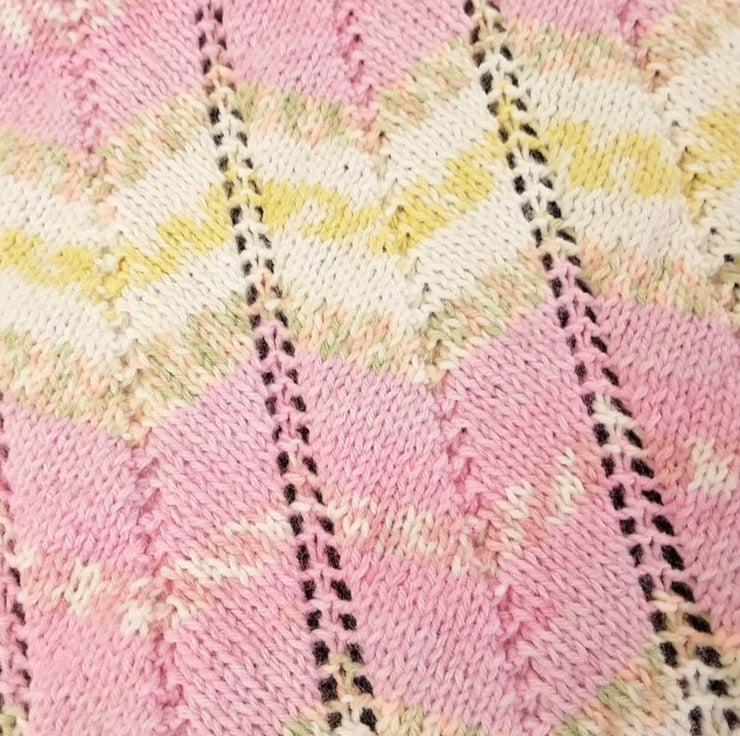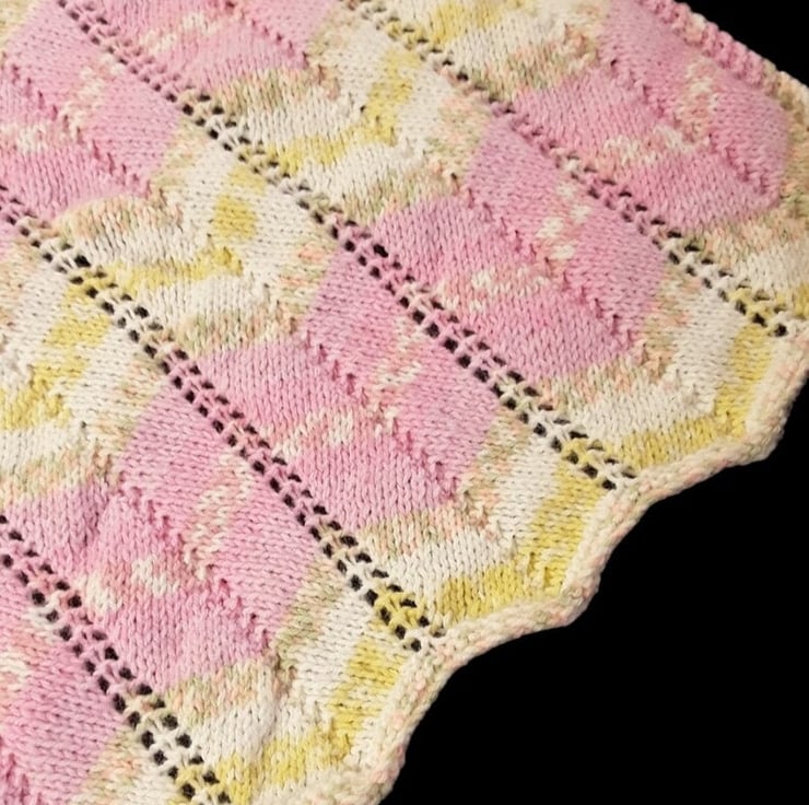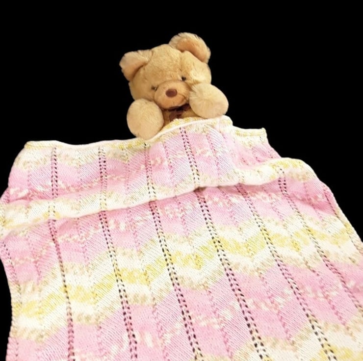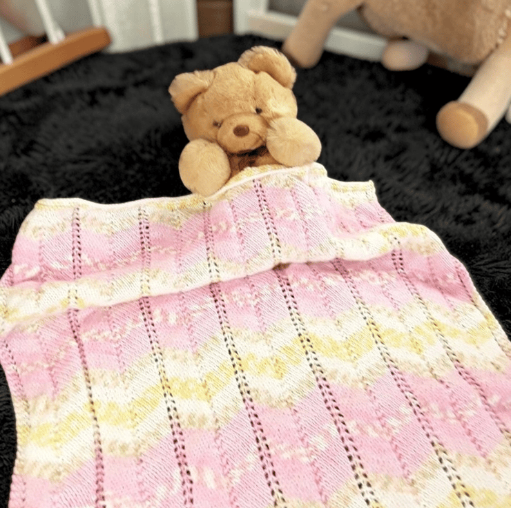 Hand-Knitted Baby Pram Blanket, adorned with a charming chevron pattern in soft shades of baby pink. Skillfully crafted, this delightful baby Afghan features a self-patterning Aran yarn, allowing the chevron knit pattern to display a beautiful array of colors, including pink, green, yellow, and white.