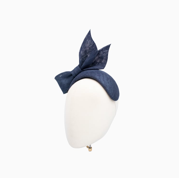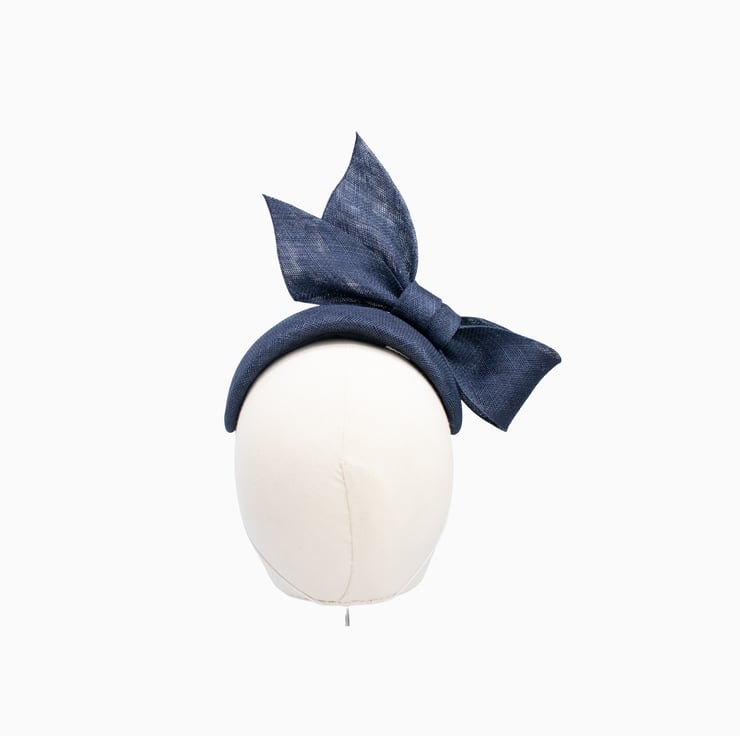A feminine and elegant statement headpiece, this striking fascinator headband is adorned with a hand-sculpted sinamay bow in a versatile navy blue tone. Crafted from sinamay (straw) and lined in pure silk dupion, it's the perfect accessory to elevate your day or evening outfits at weddings and race days. It is secured with a discreet elastic or covered metal headband.