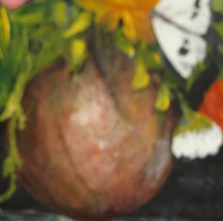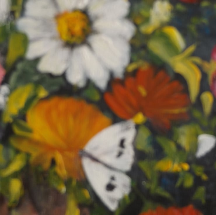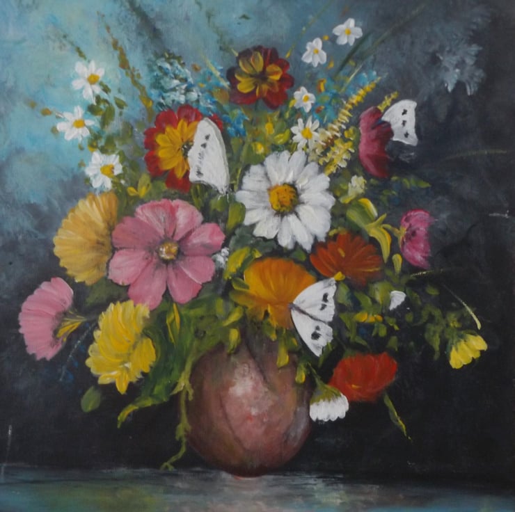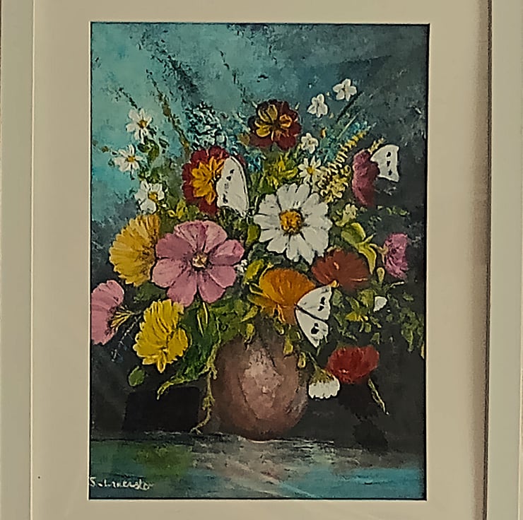 Painted in acrylic on a canvas board and framed in a white 12in x 15in frame. Butterfly Bouquet presents a lively arrangement of multicolored blooms gathered in a soft brown vase, with delicate white butterflies drifting among the petals against a textured blue-green background. Layered brushwork adds depth to the blossoms and foliage, while the contrast between warm florals and the cool backdrop creates a calm, cheerful mood. Small details—the flutter of wings and the golden centers of daisies—reward a closer look and lend the composition subtle movement. Framed this piece provides a fresh accent for living rooms, bedrooms, or workspaces, and is an effortless way to brighten your surroundings.
