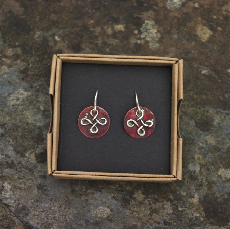 Celtic knot earrings in sterling silver onto a copper disc with a diameter of 13mm/half an inch. The copper has become a rich red colour with heat and preserved by polishing with an impregnating wax. The ear hooks are handmade using sterling silver .Total dangle is 25mm/1 inch, from top of ear hook.