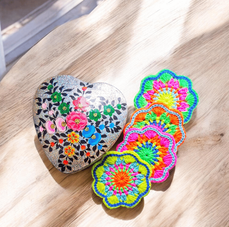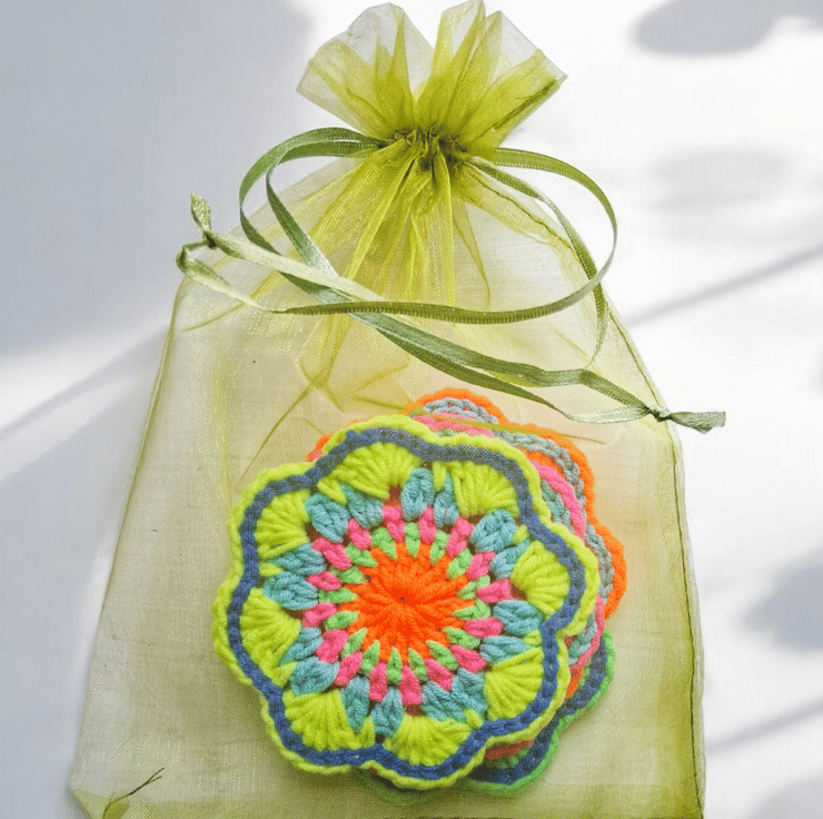 Finish off your table with this set of 4 colourful mandala flower coasters, handmade on the west coast of Scotland. These are my brightest neon. Your glasses will not stick to them like wood or plastic. Lovingly crocheted in cotton. 8.5 cm diameter.