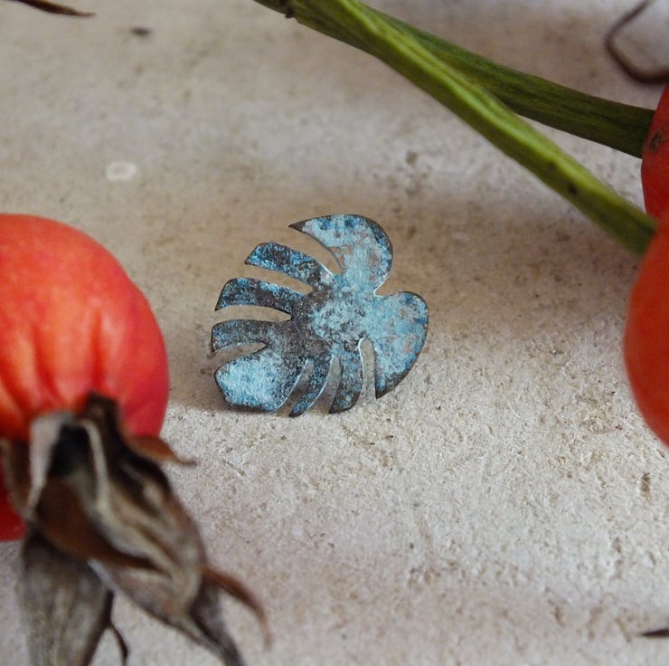 The form is pierced by hand using a jeweller's saw, creating the characteristic openings and structure of the leaf. The surface is then treated with a blue-green patina, producing soft variations in tone - from muted teal to areas where the warm copper subtly shows through.