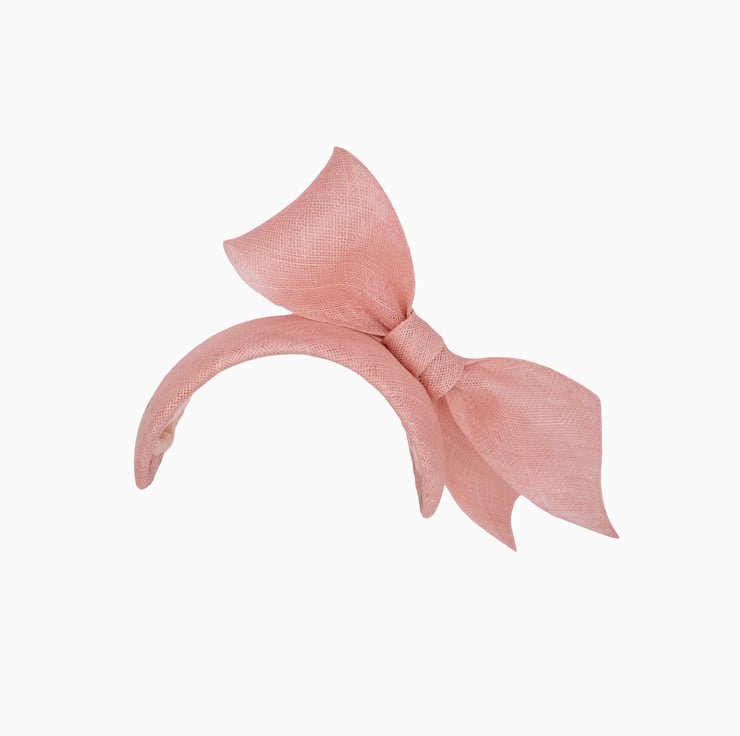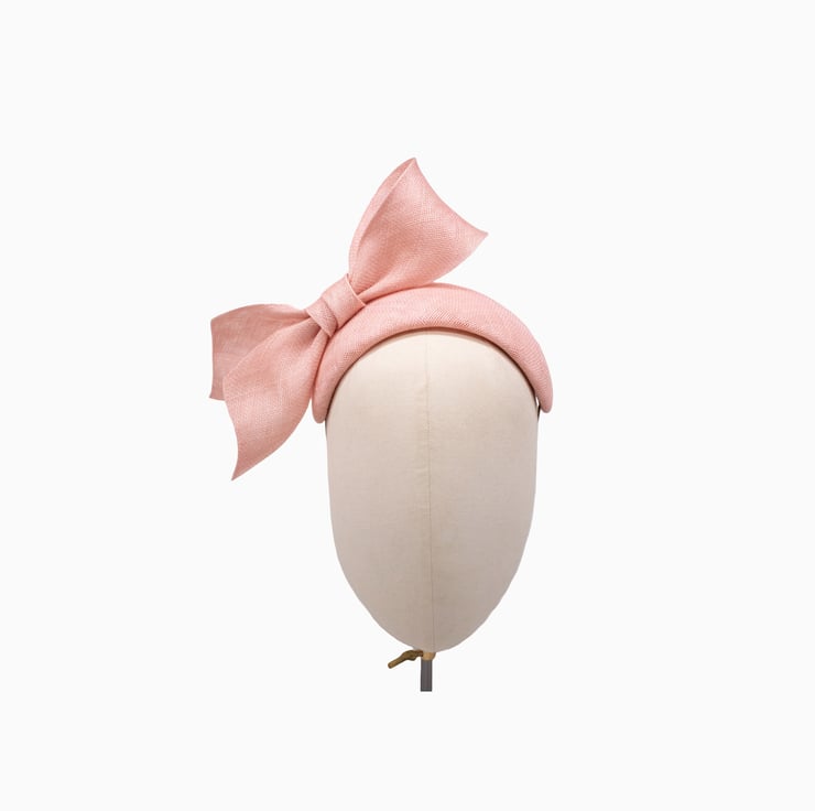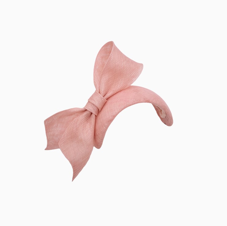 A feminine and elegant statement headpiece, this striking fascinator headband is adorned with a hand-sculpted sinamay bow in a subtle pink tone. Crafted from sinamay (straw) and lined in pure silk dupion, it's the perfect accessory to elevate your day or evening outfits at weddings and race days. It is secured with a discreet elastic or covered metal headband.