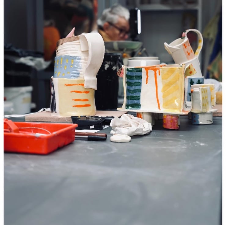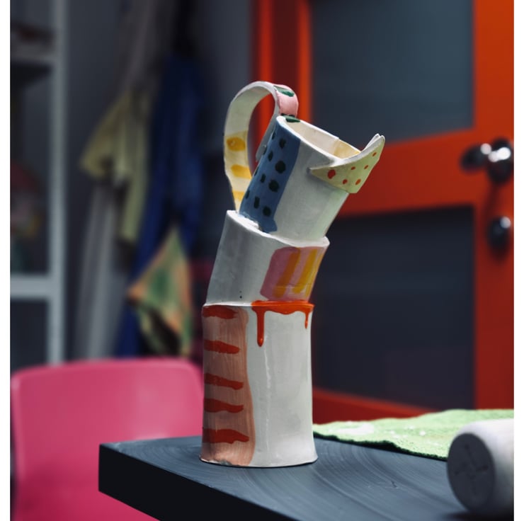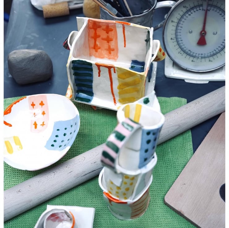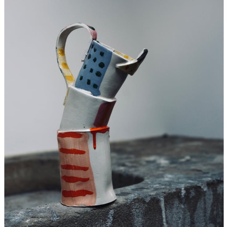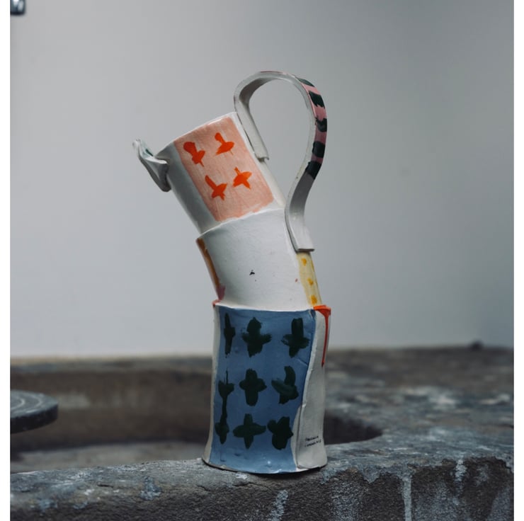 The Jugs, Mugs, Vessels & Dishes series features slab built white earthenware, coloured slip, transparent glaze and coloured onglaze.