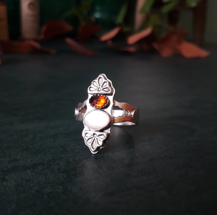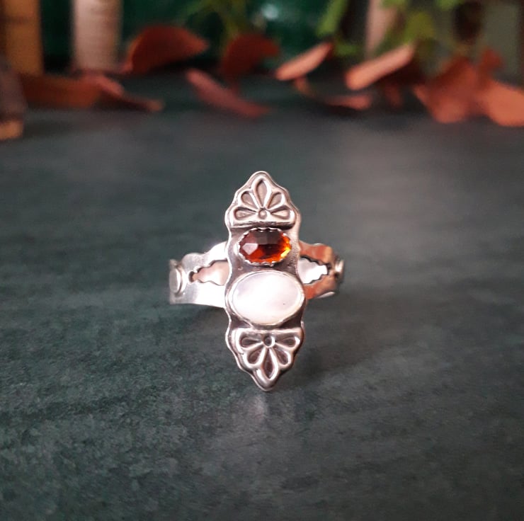 The ring has a UK size U and has polished antique silver finish. The ring band is 5mm wide. The hessonite garnet is 6mm big, the mother of pearl 8mm. It comes lovingly gift wrapped in a box and an organza pouch.