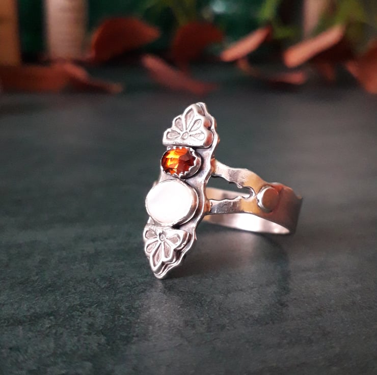 A big gemstone statement ring with a stunning, warm hessonite garnet and mother of pearl stone. Lots of detail went into this ring, with flowy waves worked into the ring band. An ode to last century's hippie romantic, channeling art noveau and Stevie Nicks vibes.