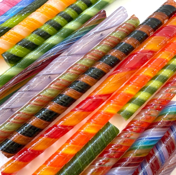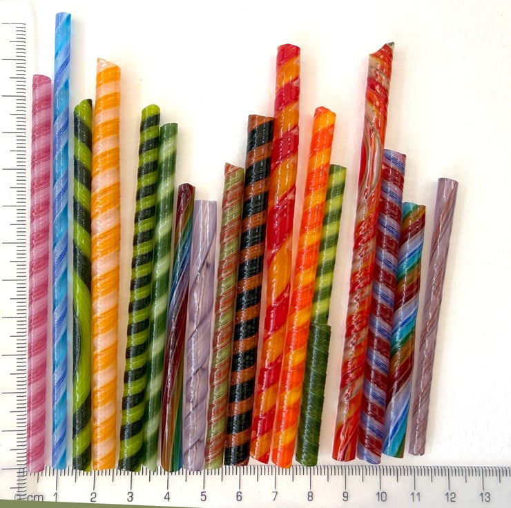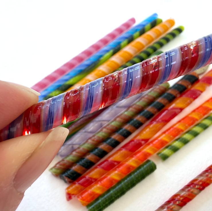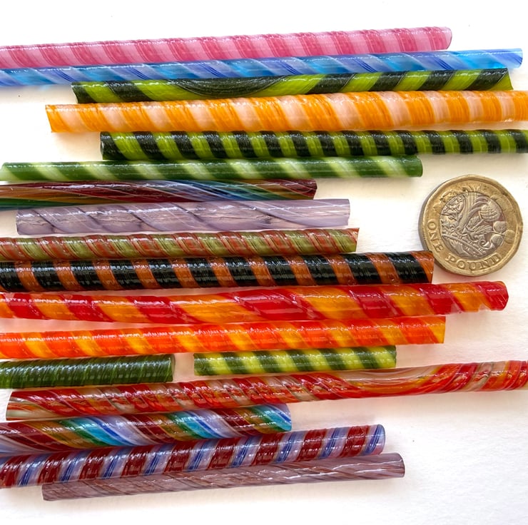 Bullseye 90 coe glass handmade twisty cane offcuts so uneven widths (approx 4-6mm) and lengths (approx 4-14cms).