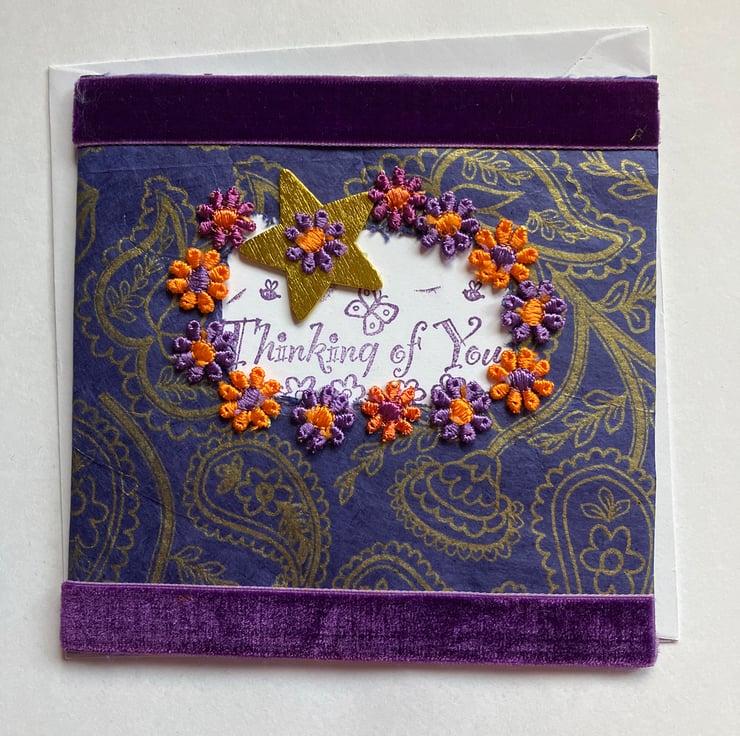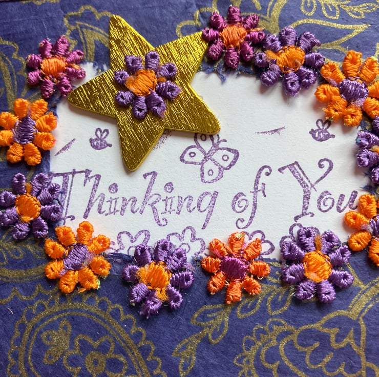 In the middle the words Thinking of You are stamped in purple ink with butterfly and flowers too.