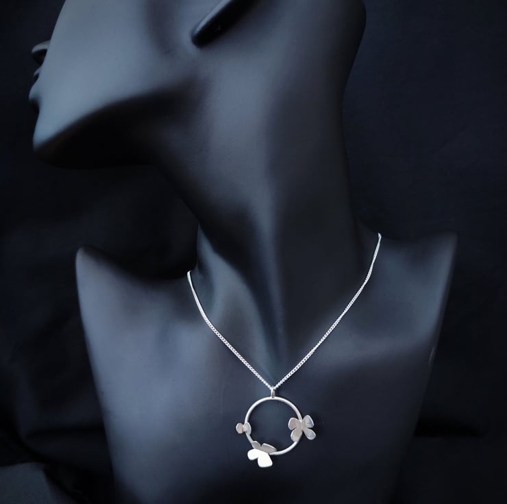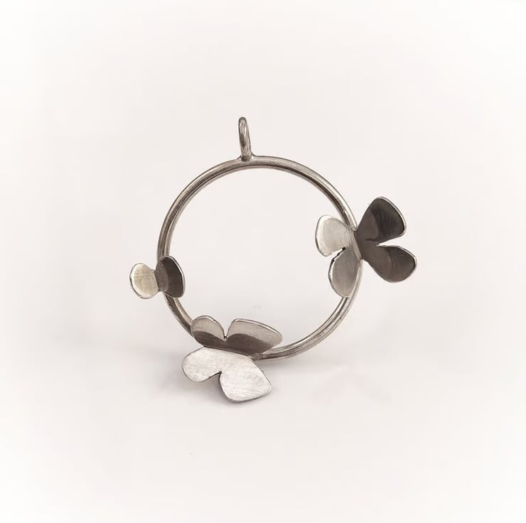 Sterling silver pendant with 3 little butterflies sitting on the silver hoop.