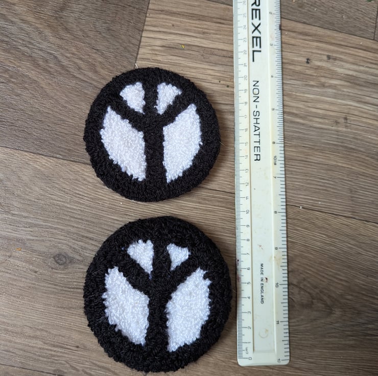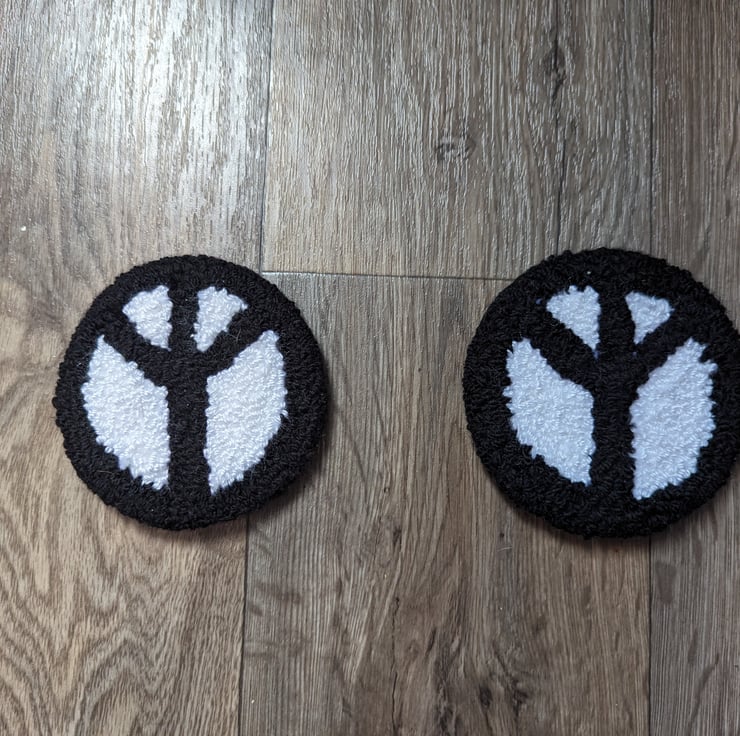 A pair of handmade mug rugs or coaster, made with acrylic yarn with a thick felt backing.