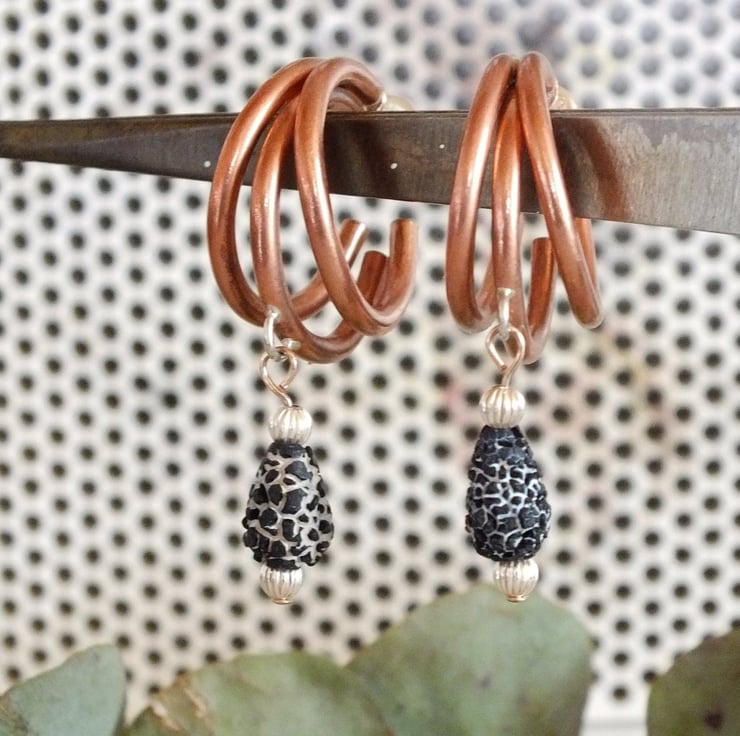 A carefully composed pair of mixed metal hoop combining copper, sterling silver, and weathered agate.