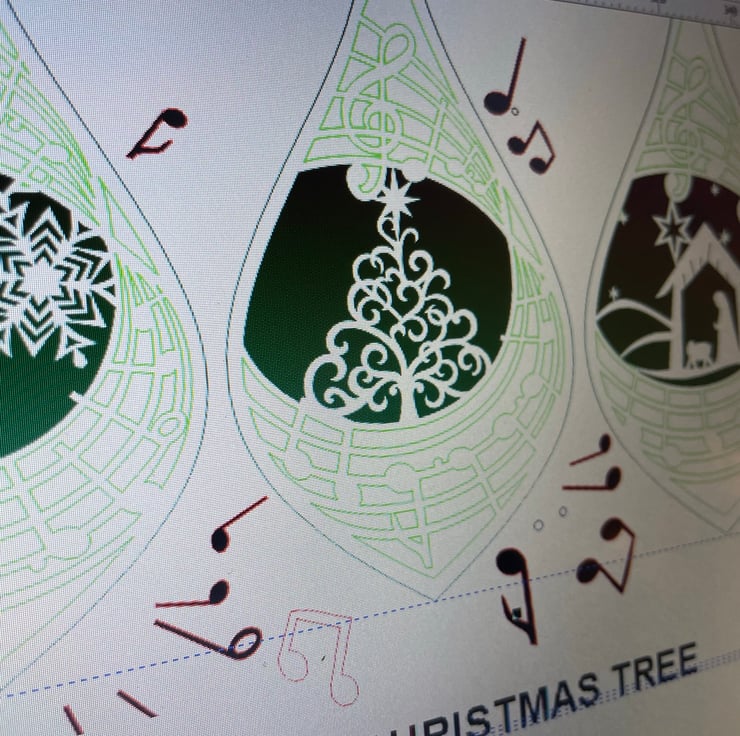 The music curls round a cut-out tree so that it can be read from both sides of the decoration.