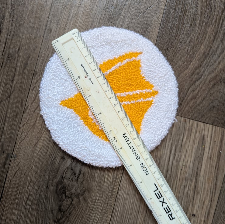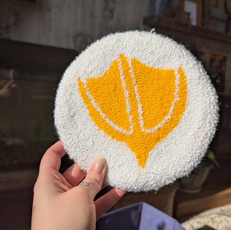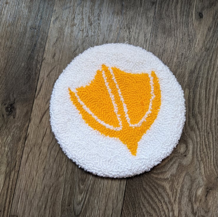 A handmade, needle punched mug rug, coaster or general decoration, made from acrylic yarn with a black felt backing.