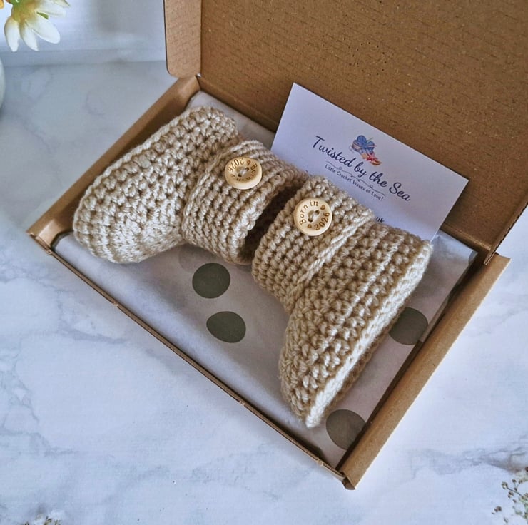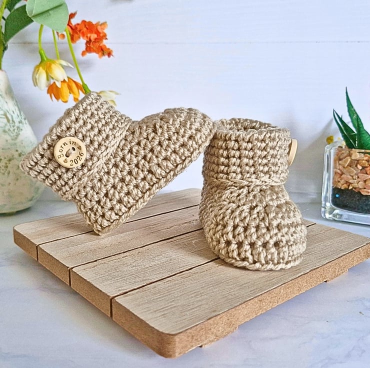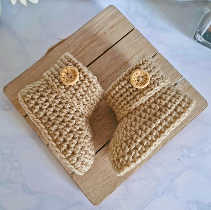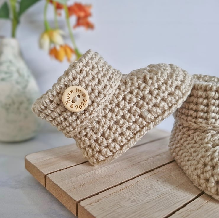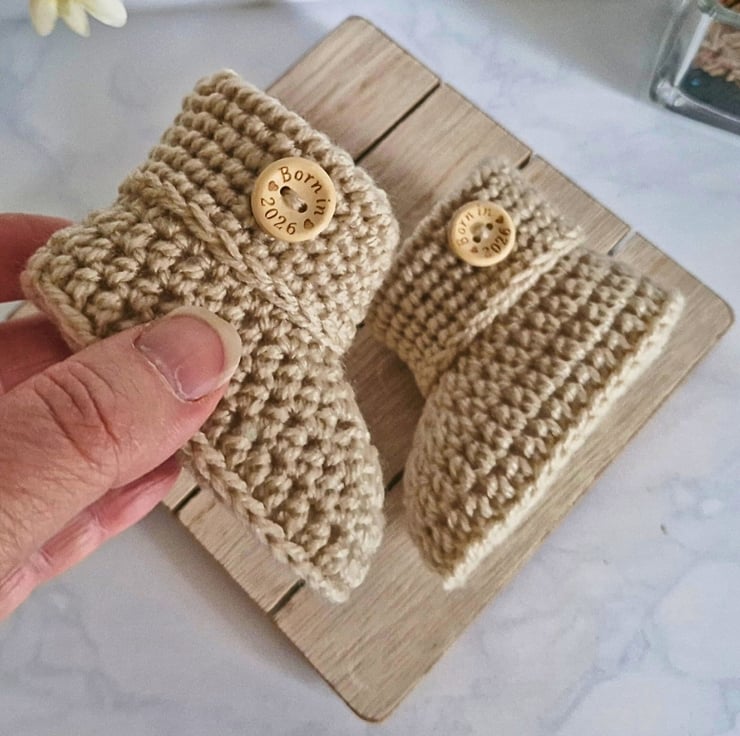 Celebrate a new arrival with these adorable handmade crochet baby booties, finished with a wooden button that reads 'Born in 2026'. A thoughtful gift for baby showers, pregnancy announcements or new parents, these soft baby shoes are designed with both comfort and cuteness in mind.