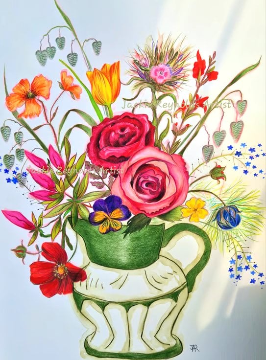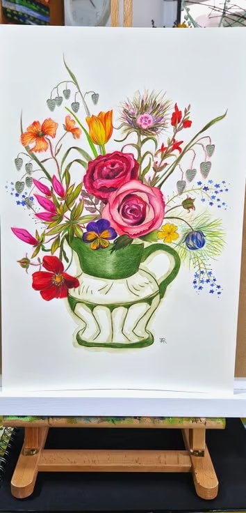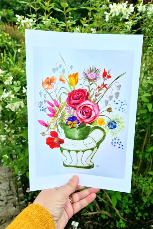 Beautiful, vibrant, floral arrangement print. Prints are taken from my original, detailed hand drawn, pencil and watercolour artwork.